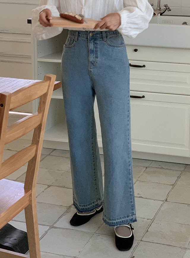 내추럴한 밑단 워싱 포인트가 있는 와이드 데님팬츠
