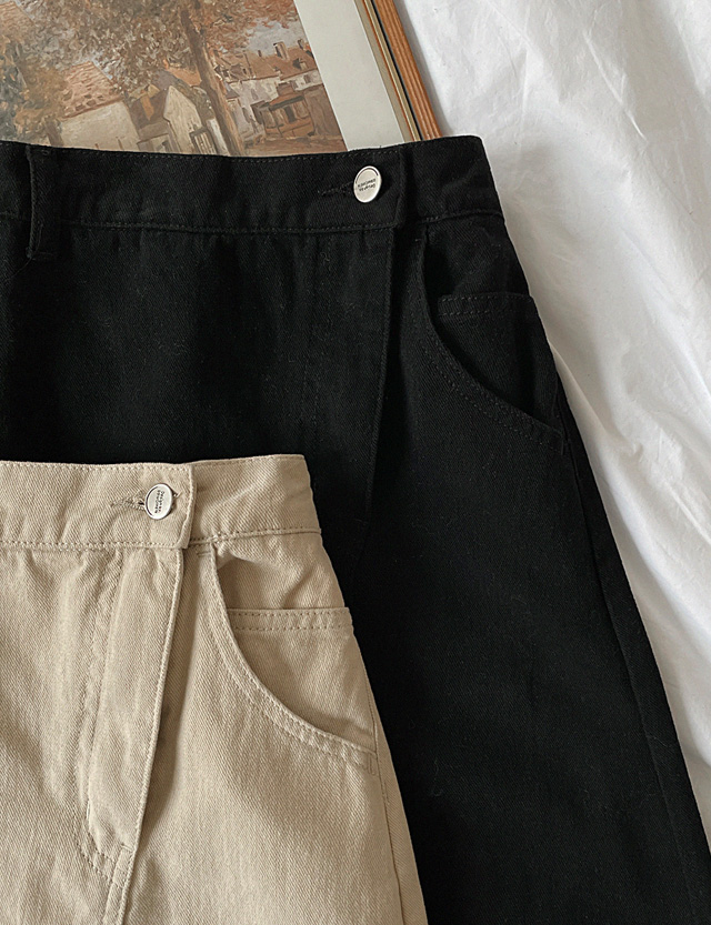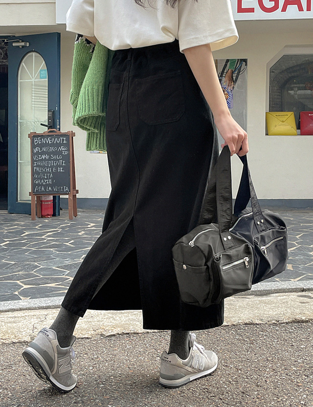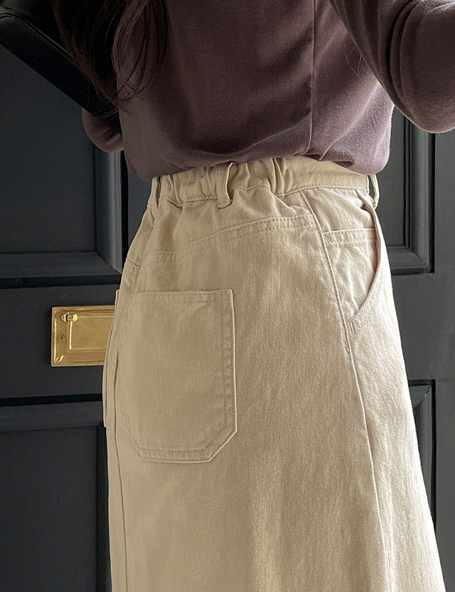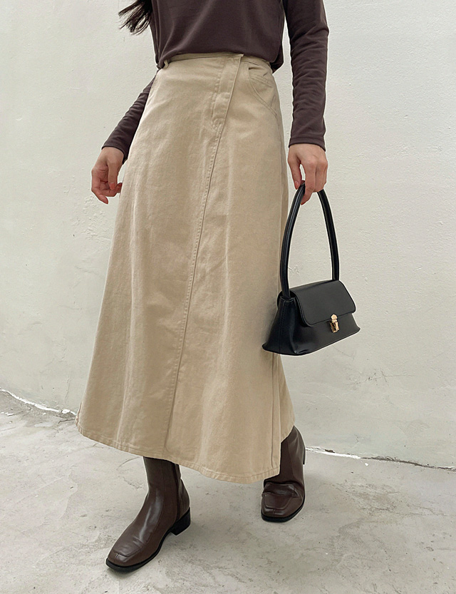 유니크한 사선 절개 라인과 사이드 포켓이 포인트인 코튼 스커트