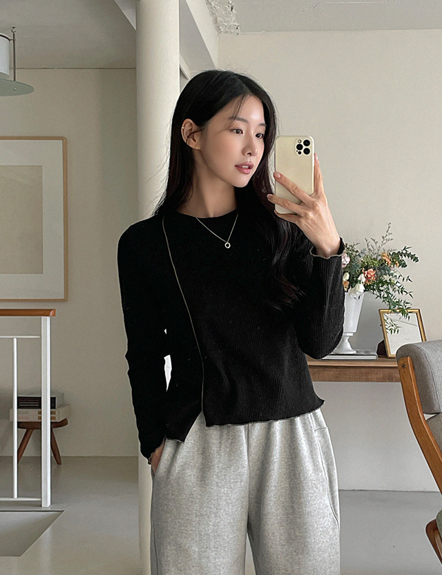 유니크하면서 트렌디한 무드가 물씬 느껴지는 언발 골지 티셔츠