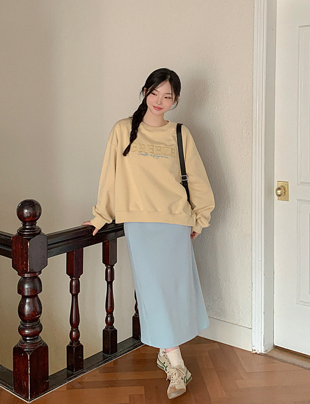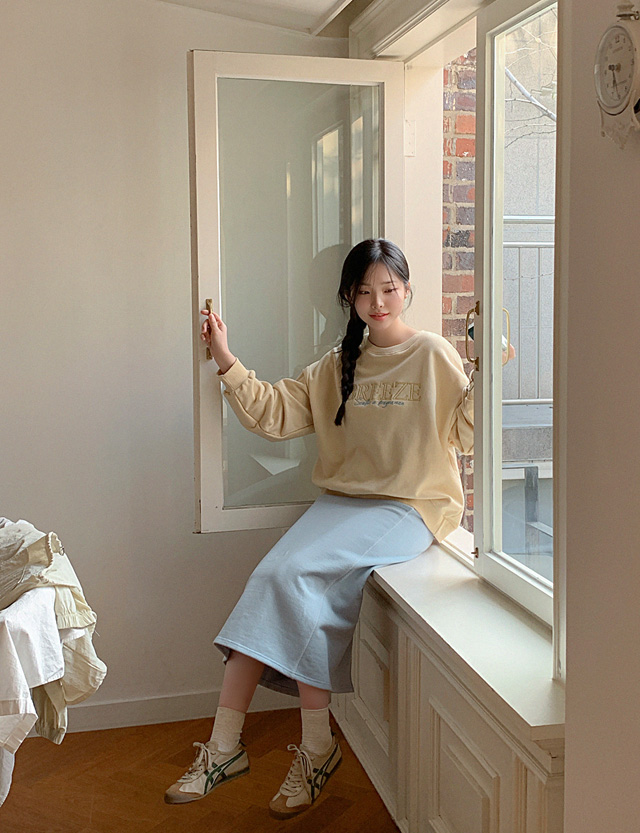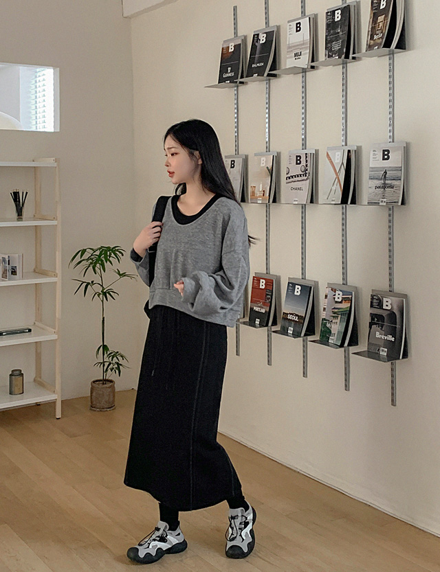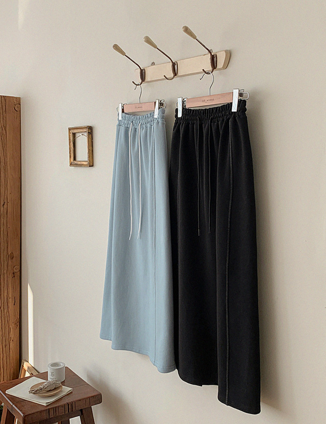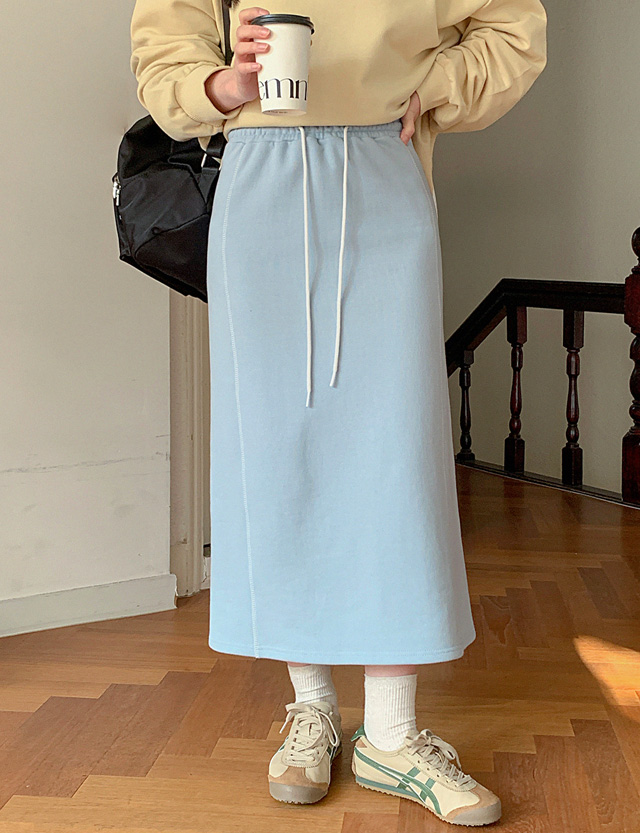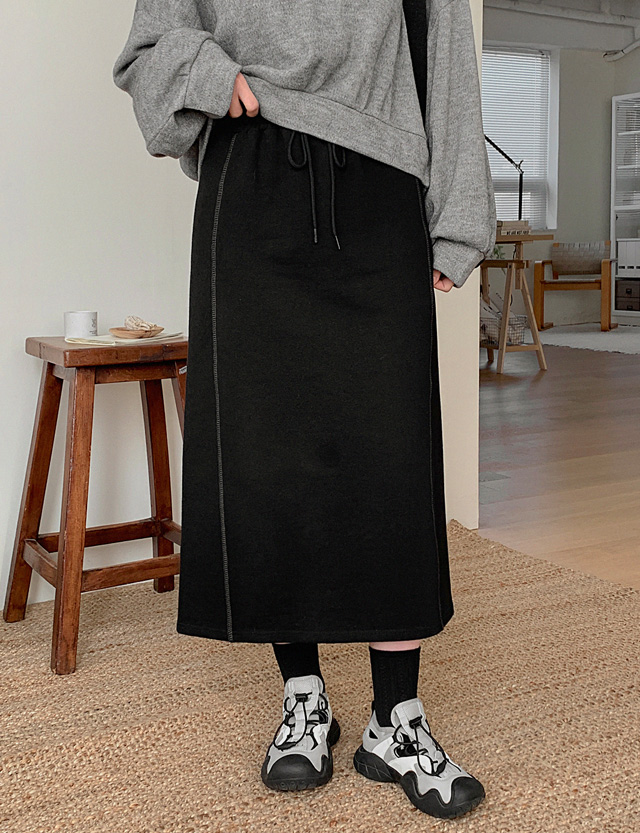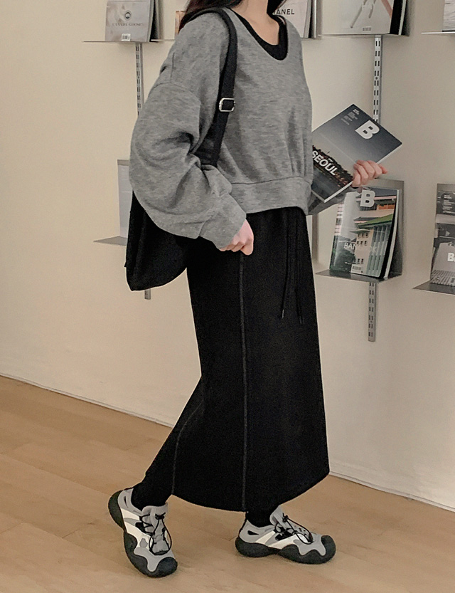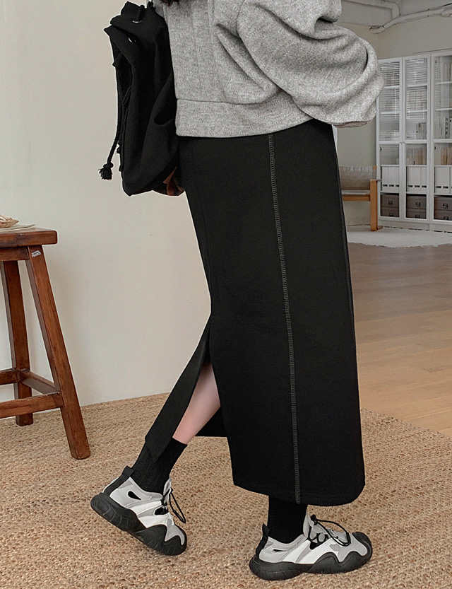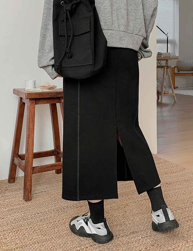 롱한 기장감에 뒷트임으로 웨어러블 하게 착용 가능한 스커트