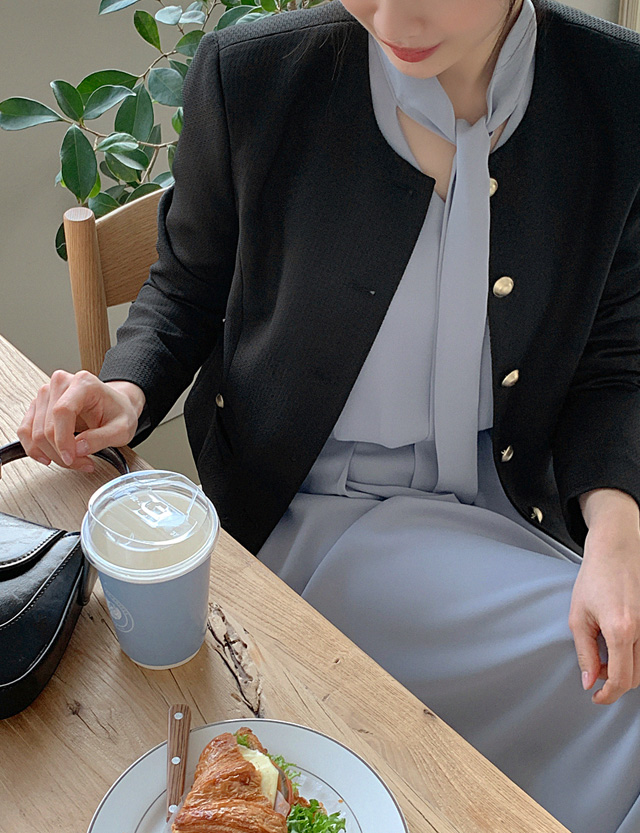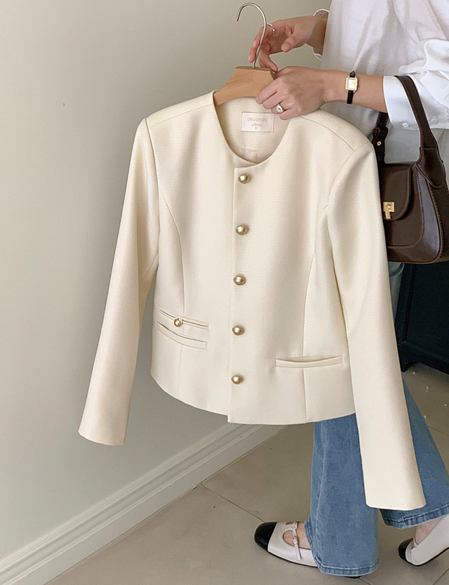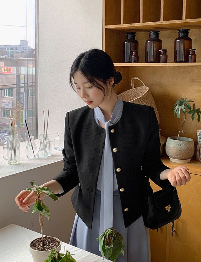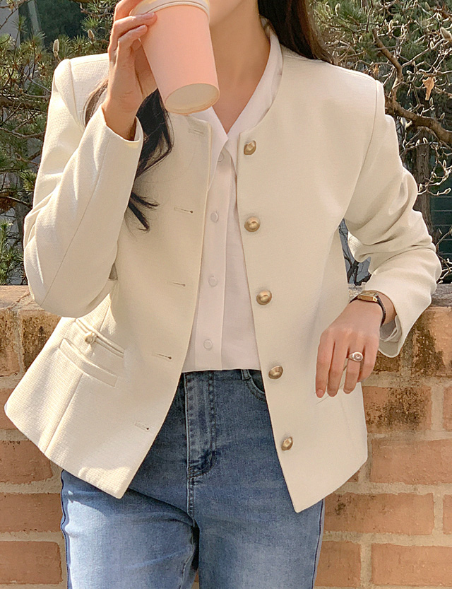 차분하면서 깔끔한 무드를 연출해주는 노카라 자켓