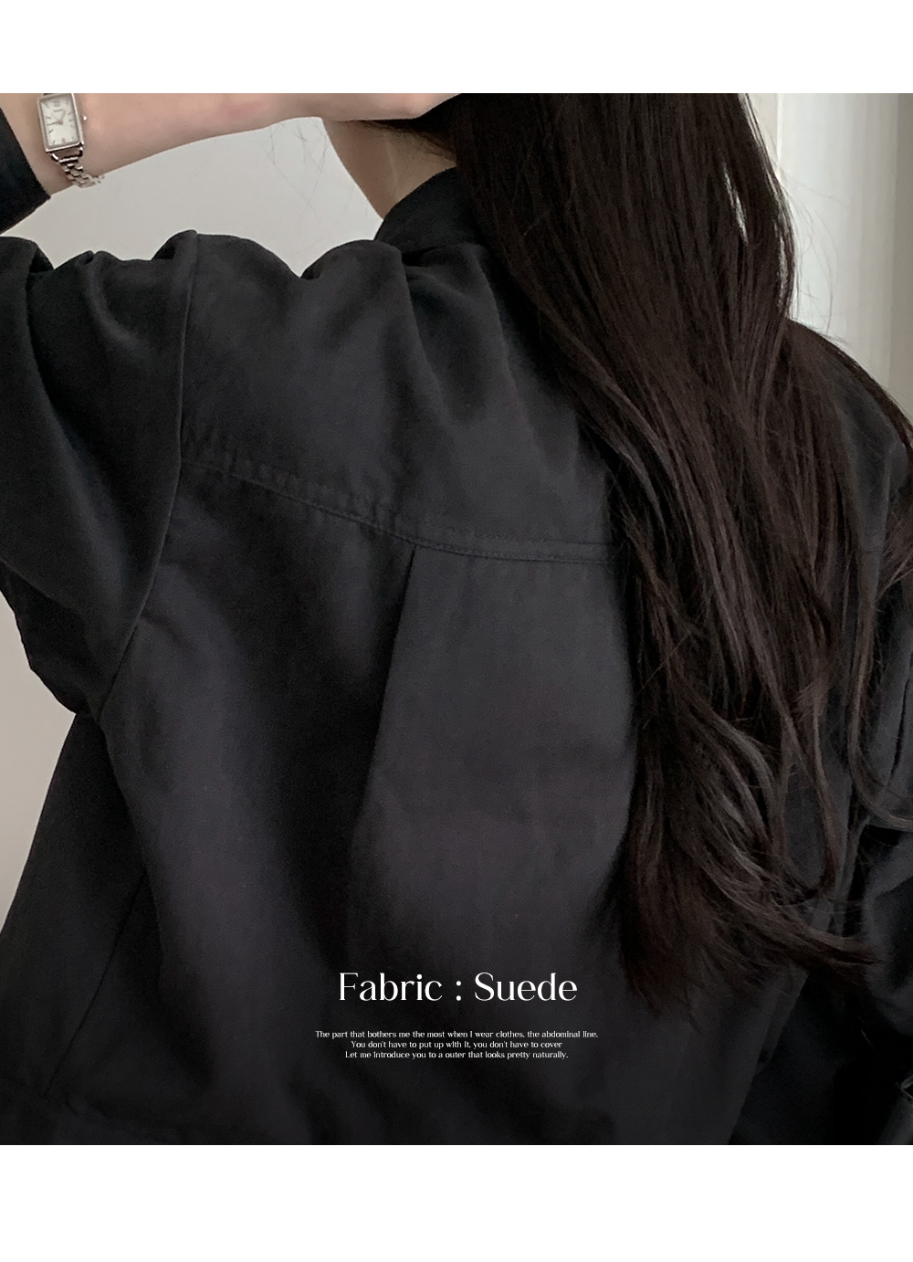 - 스웨이드 터치감에 얇은 나일론 폴리 원단으로 가볍고 어디에나 입기 좋은 소재