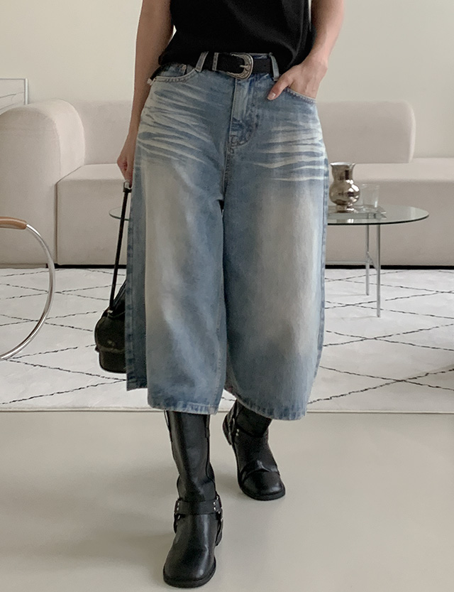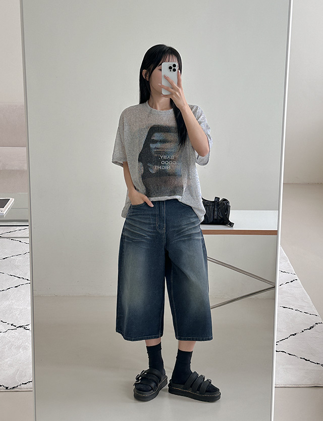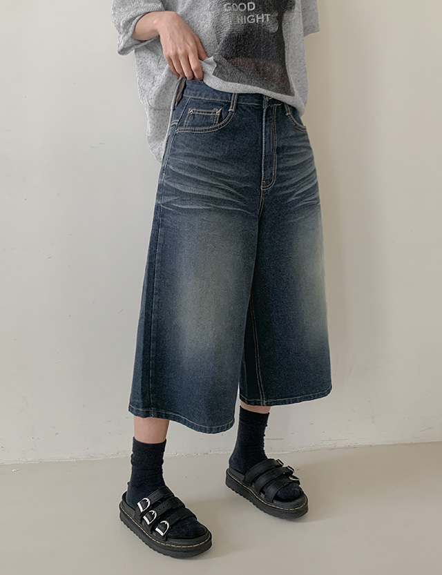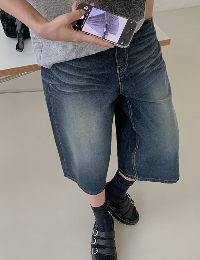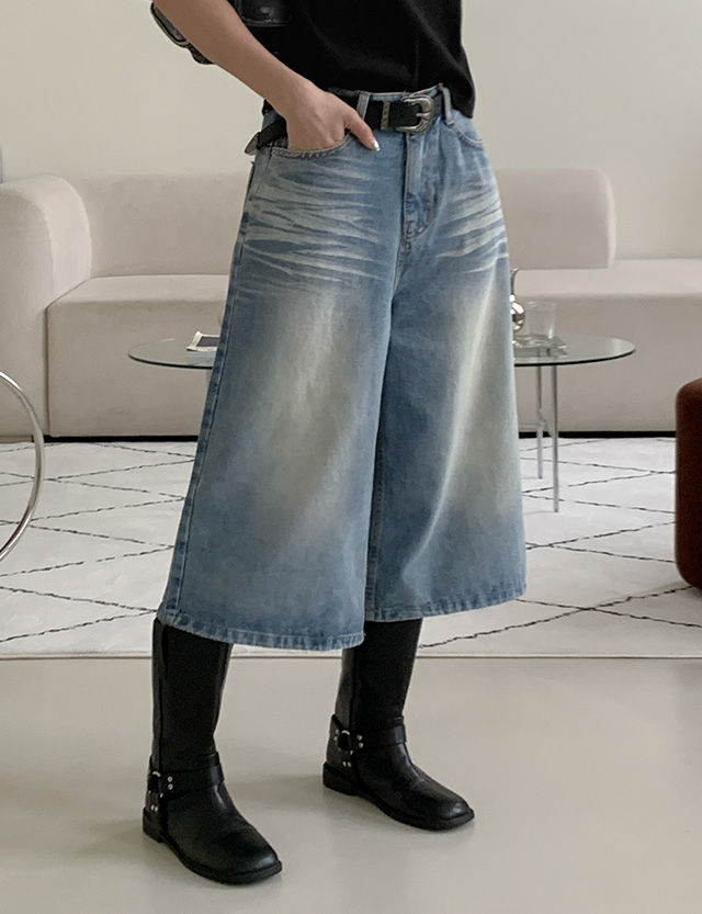 캣워싱 宽 七分裤 牛仔色 短裤 77177