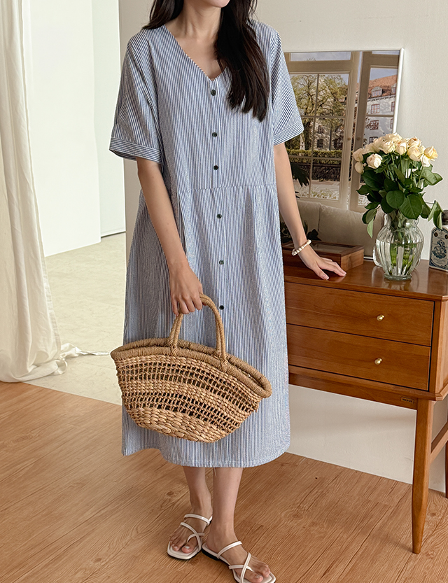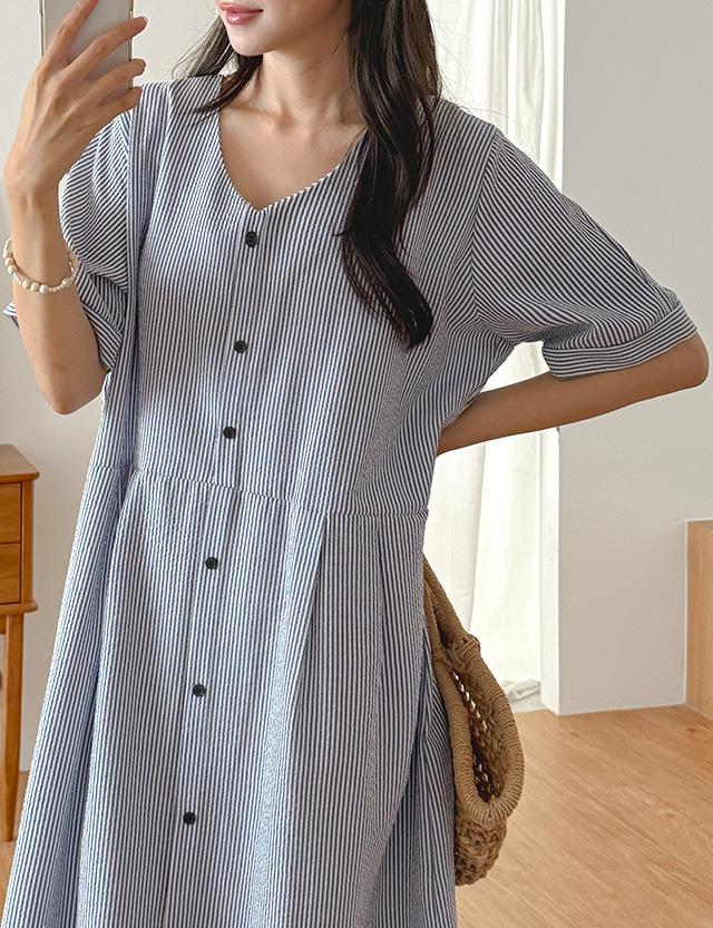 스트라이프 패턴과 브이넥 라인이 포인트가 되어