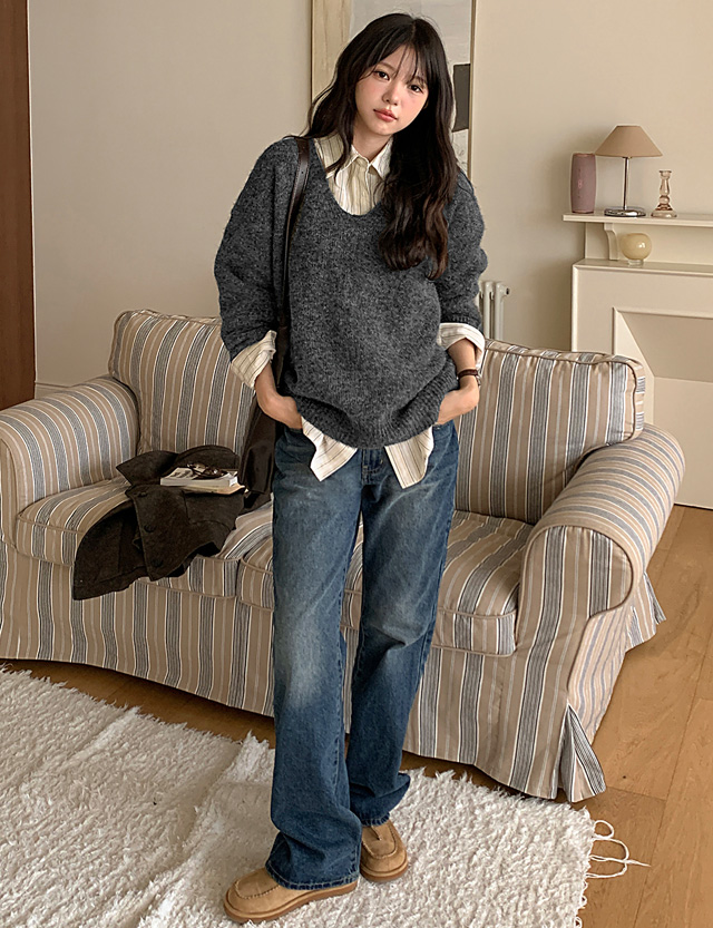 헤어리 羊驼毛 羊毛 V领 针织衫 围巾 设置 84226