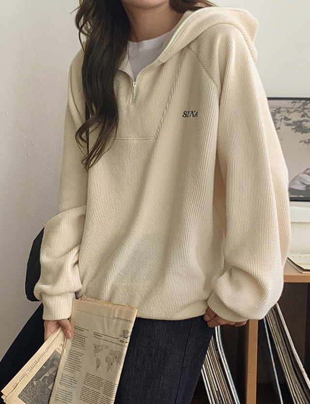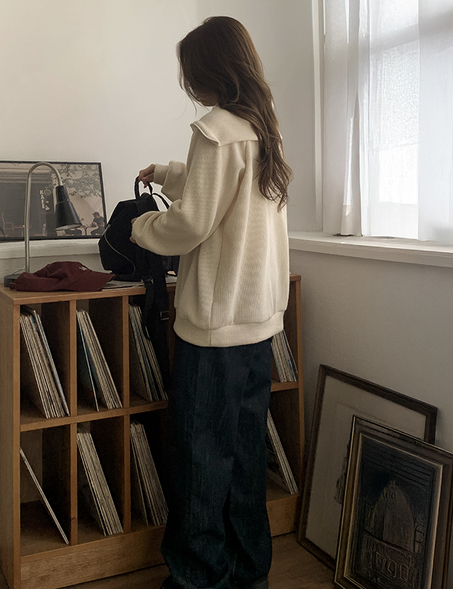 니트 텍스쳐에 반집업 디테일이 매력적인 루즈핏 자수 맨투맨