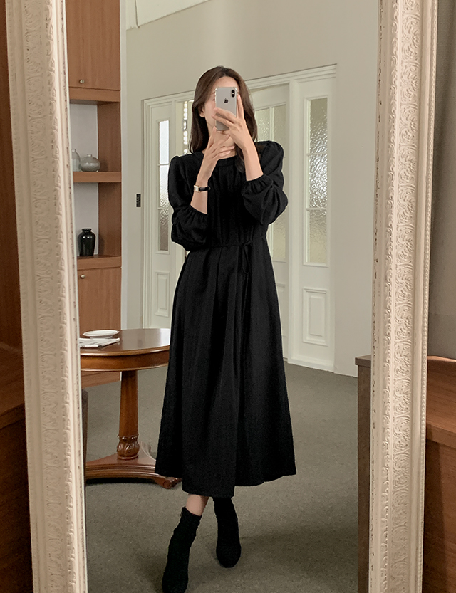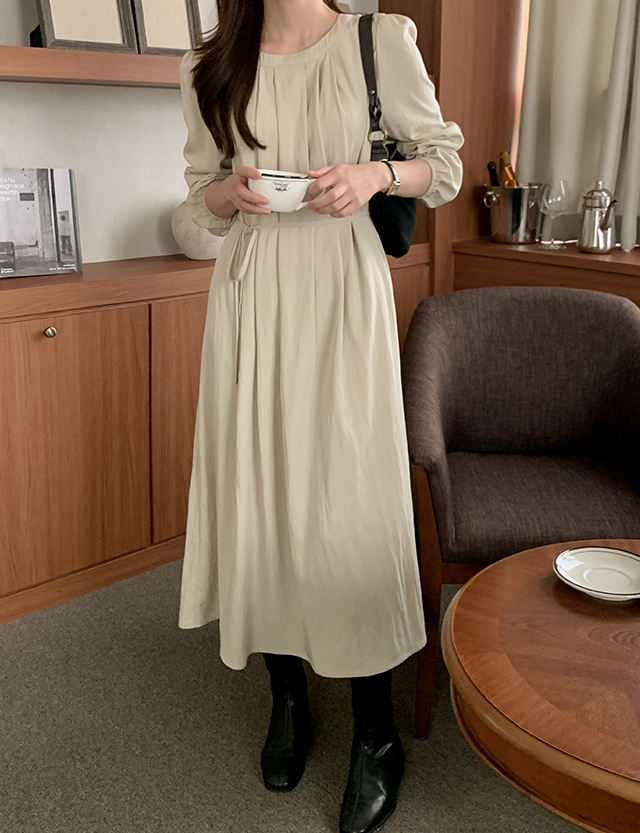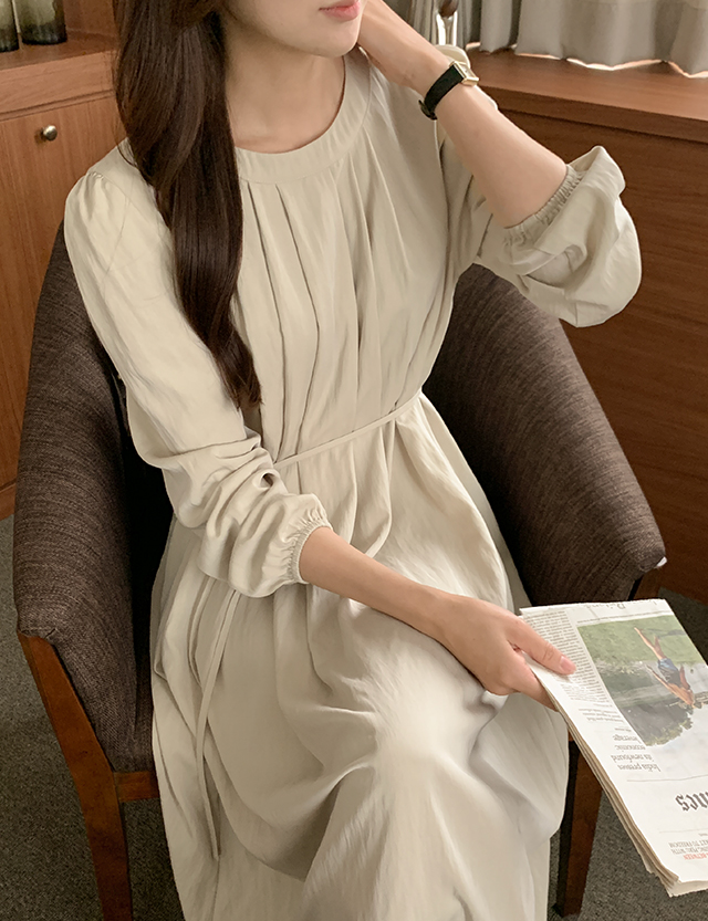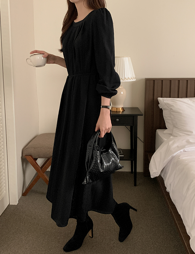 포인트를 더한 페미닌한 무드의 롱 원피스