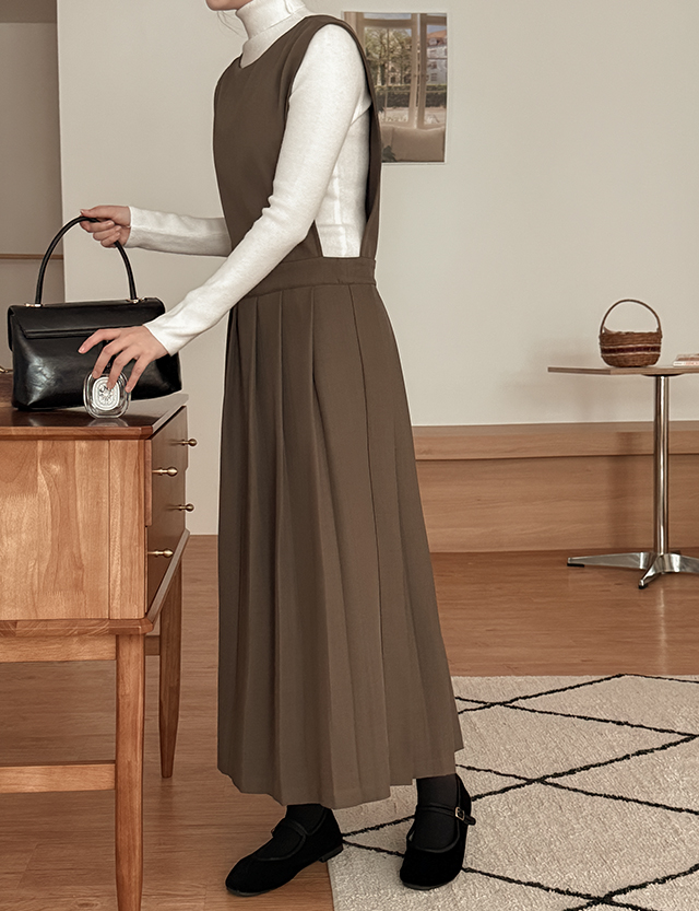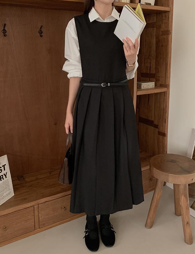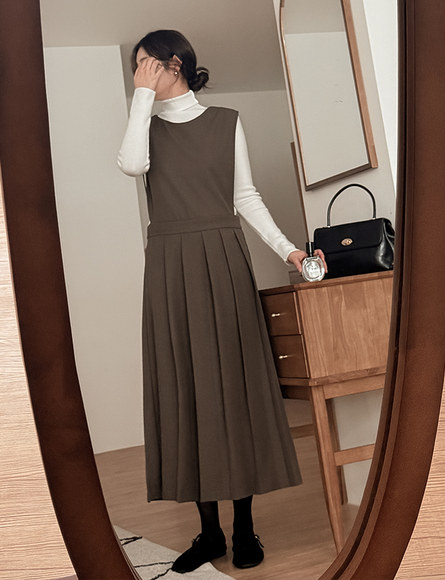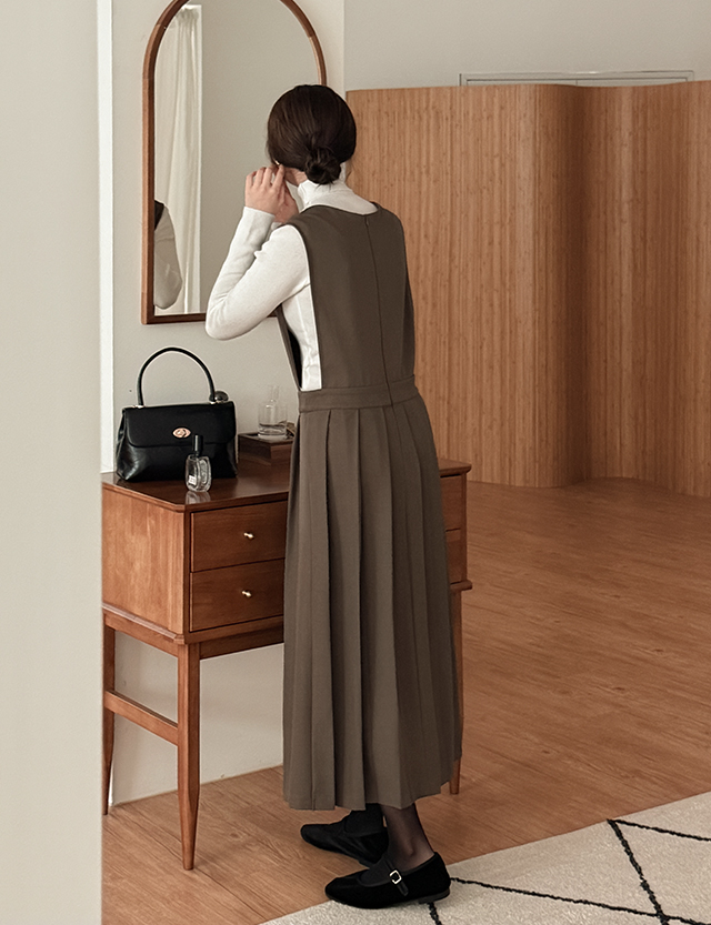 라운드넥의 단정함과 롱 플리츠의 드레시함,