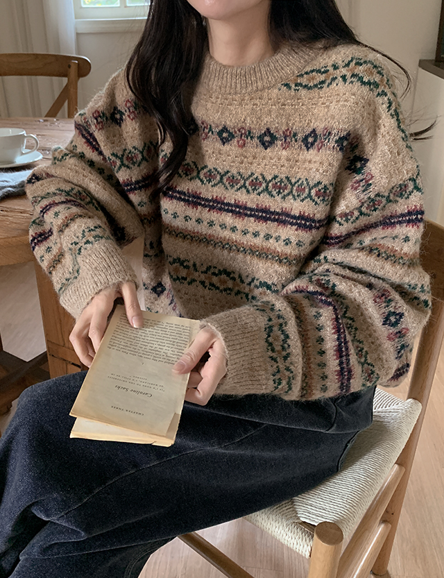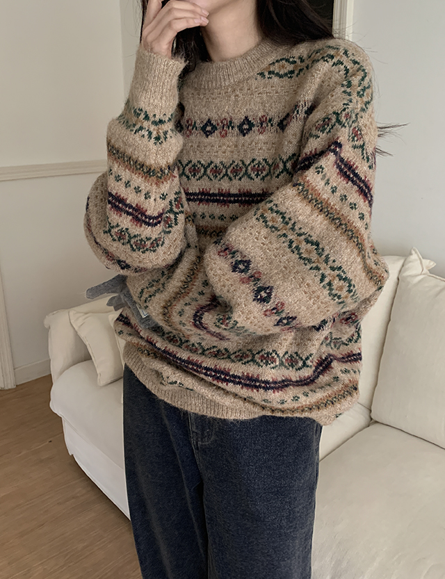 포근하고 멋스러운 패턴의 루즈핏 라운드 니트