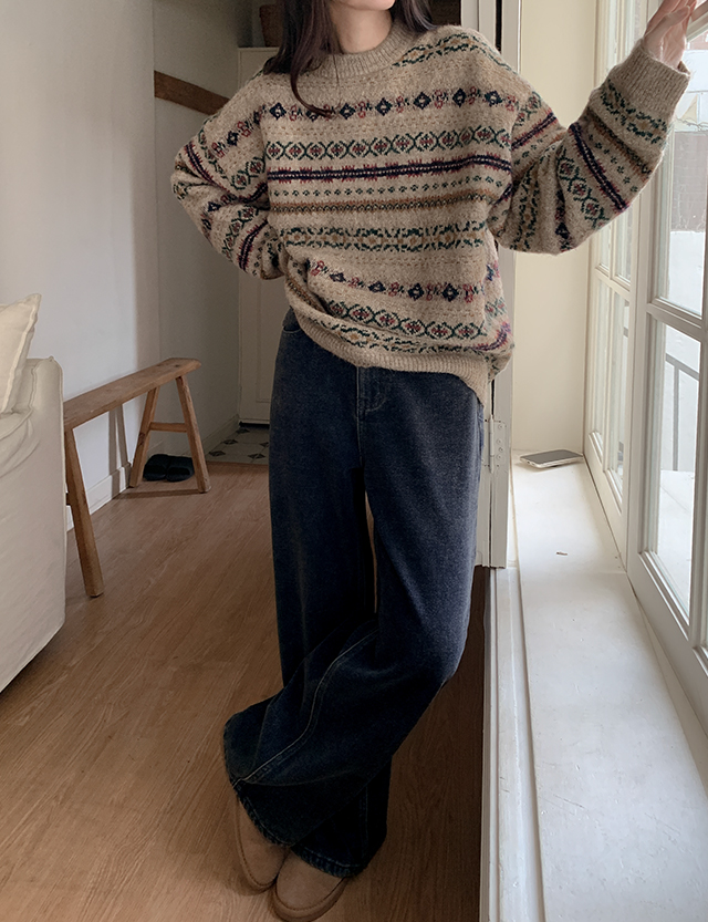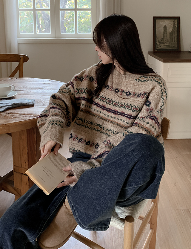 • 페어 花 아일 圆领 宽松 羊毛 针织衫 85288