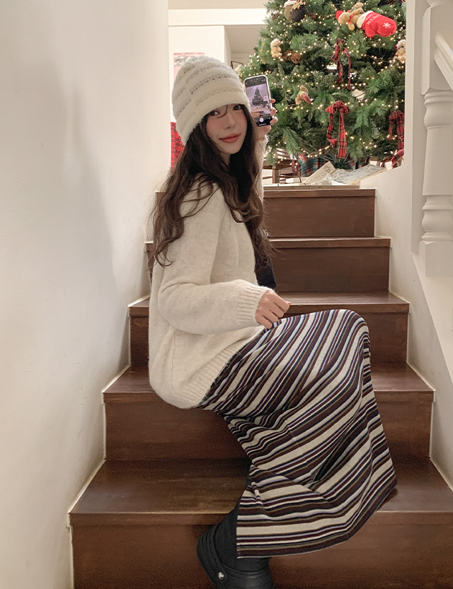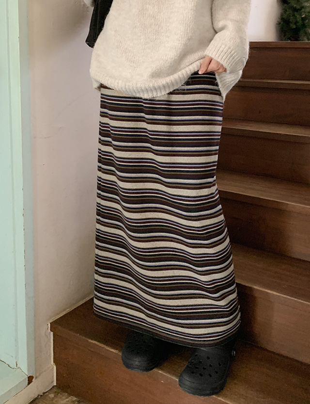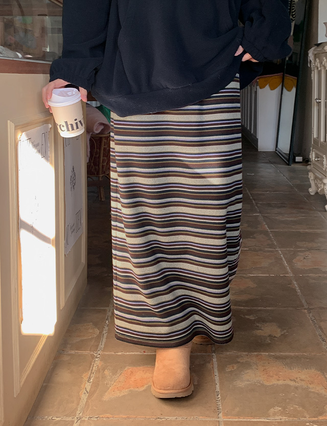 卡布基诺 条纹 皮草大衣 拉绒 맥시 松紧带 裙子 85465
