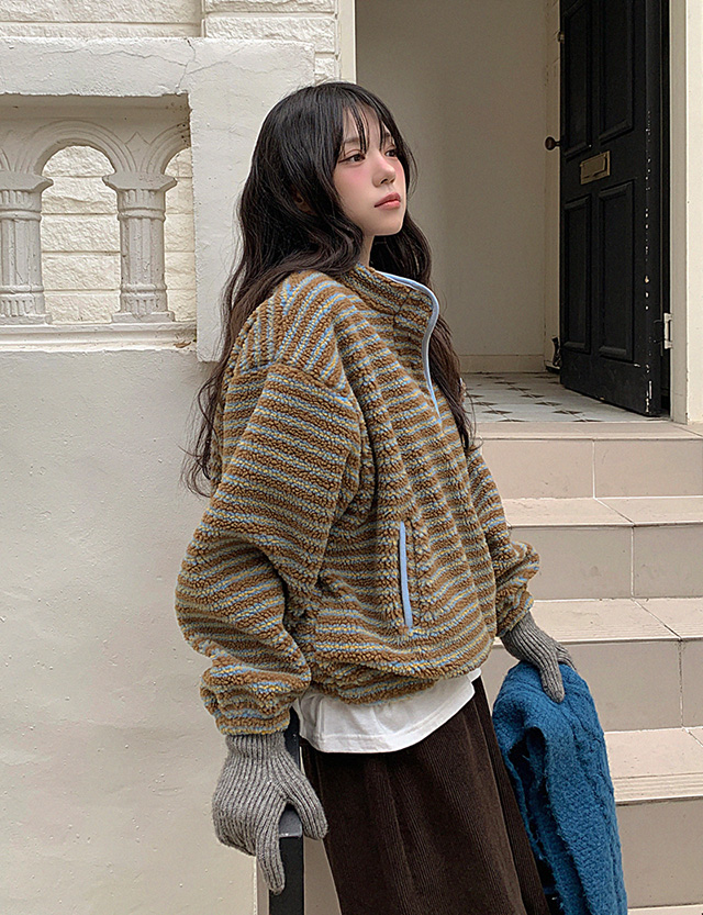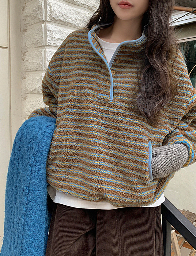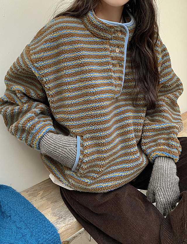 프리첼 配色 条纹 金羊毛 套头卫衣 85749