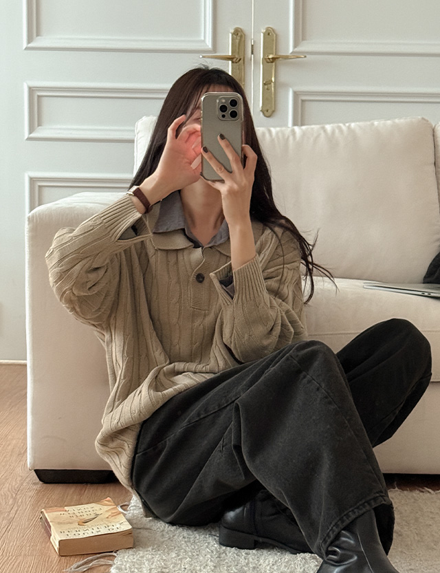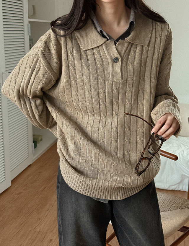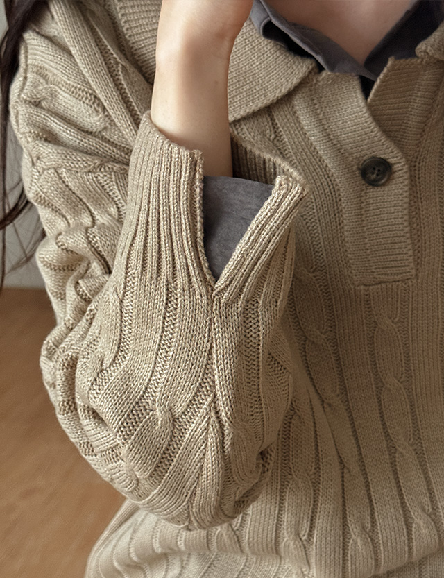 꽈배기 짜임과 카라, 버튼 디테일이 더해져