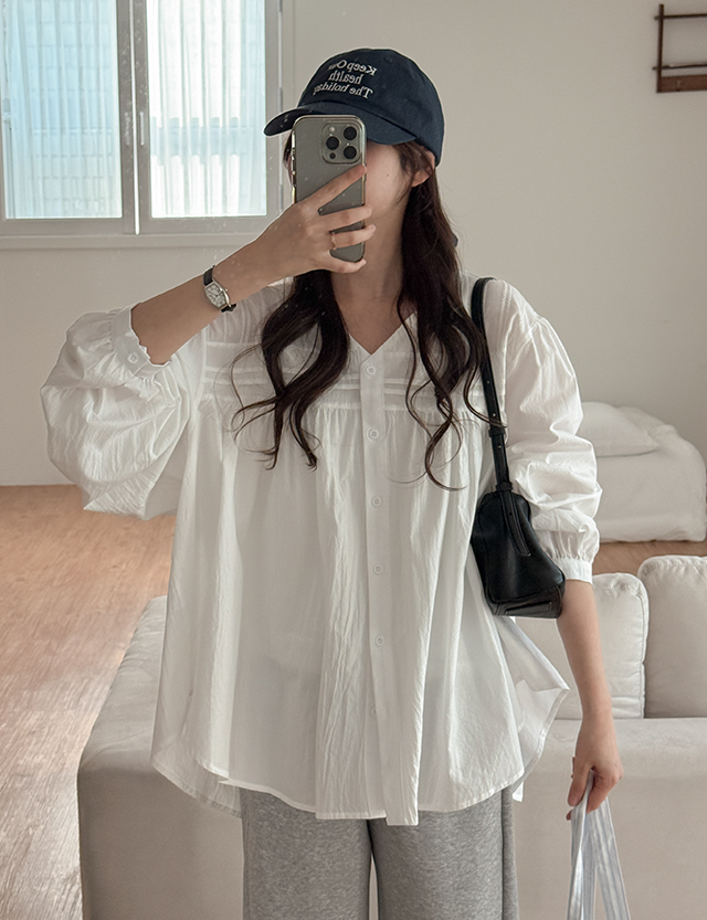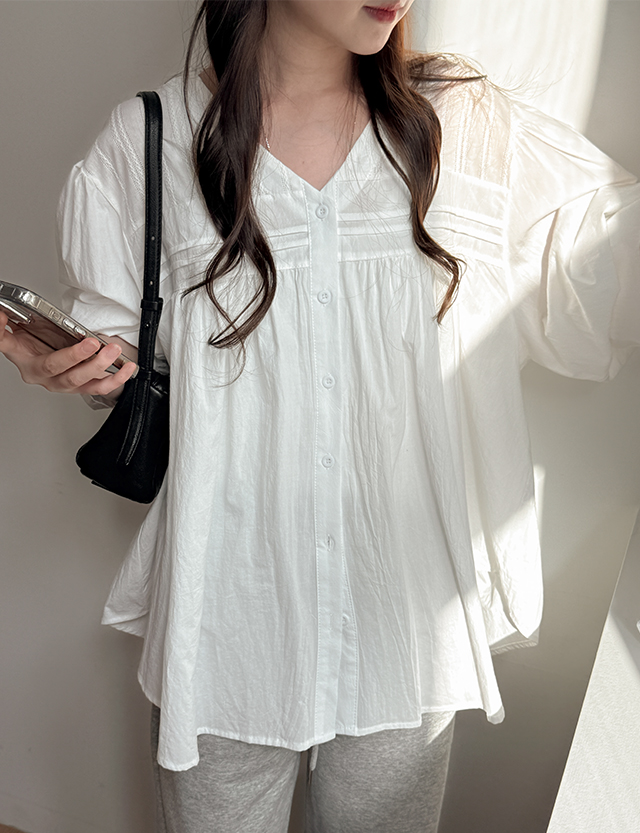 - 브이넥과 핀턱·레이스 디테일로 은은한 포인트