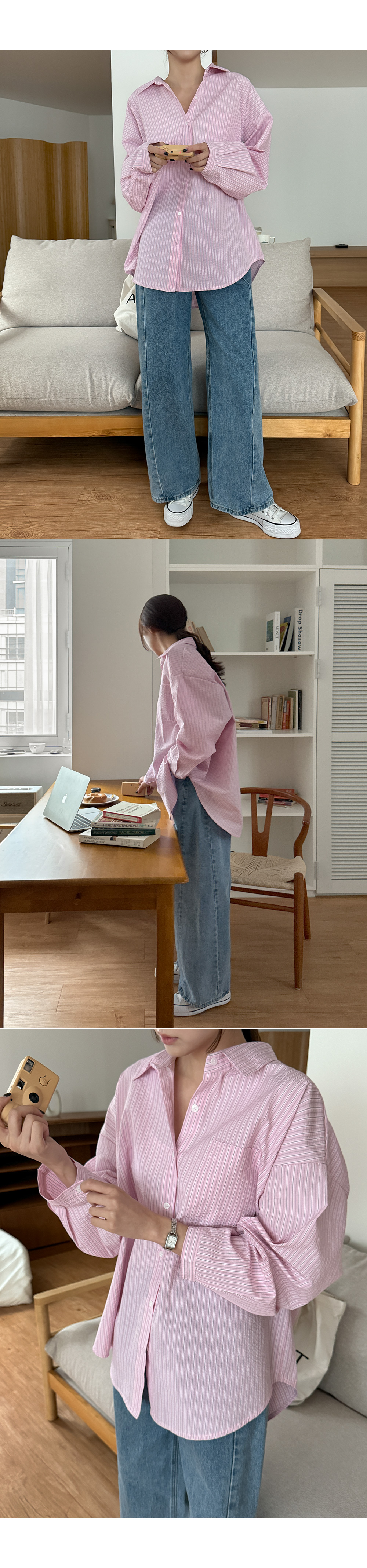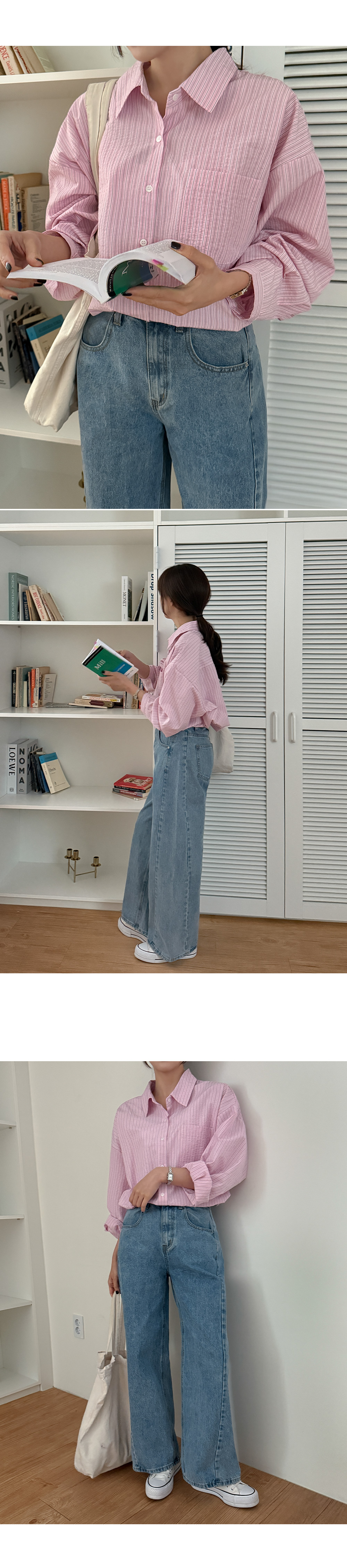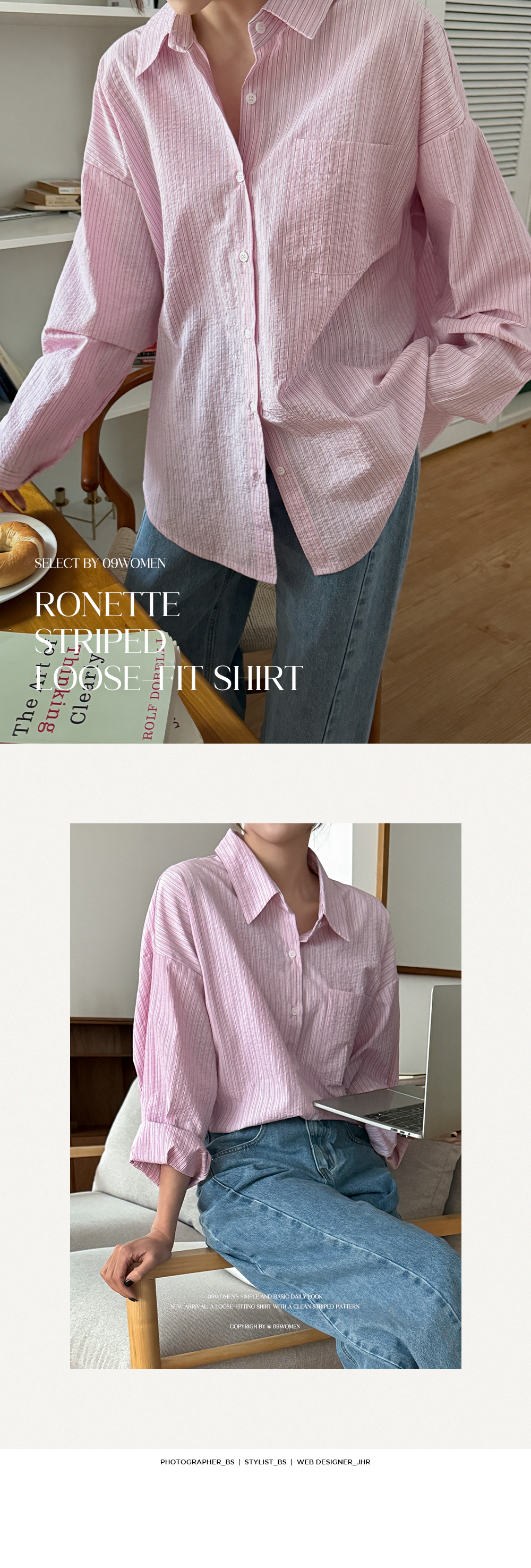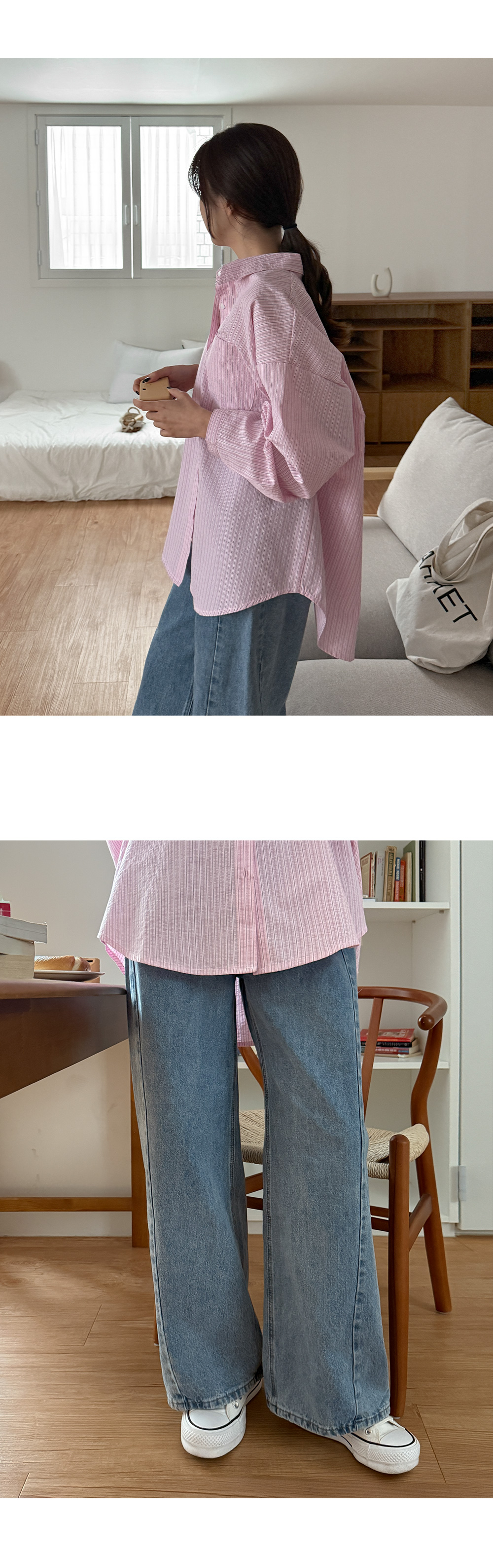- 전체 스트라이프 디테일이 룩에 은은한 포인트 연출