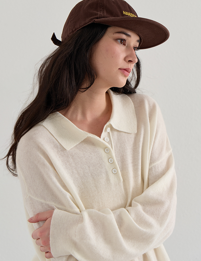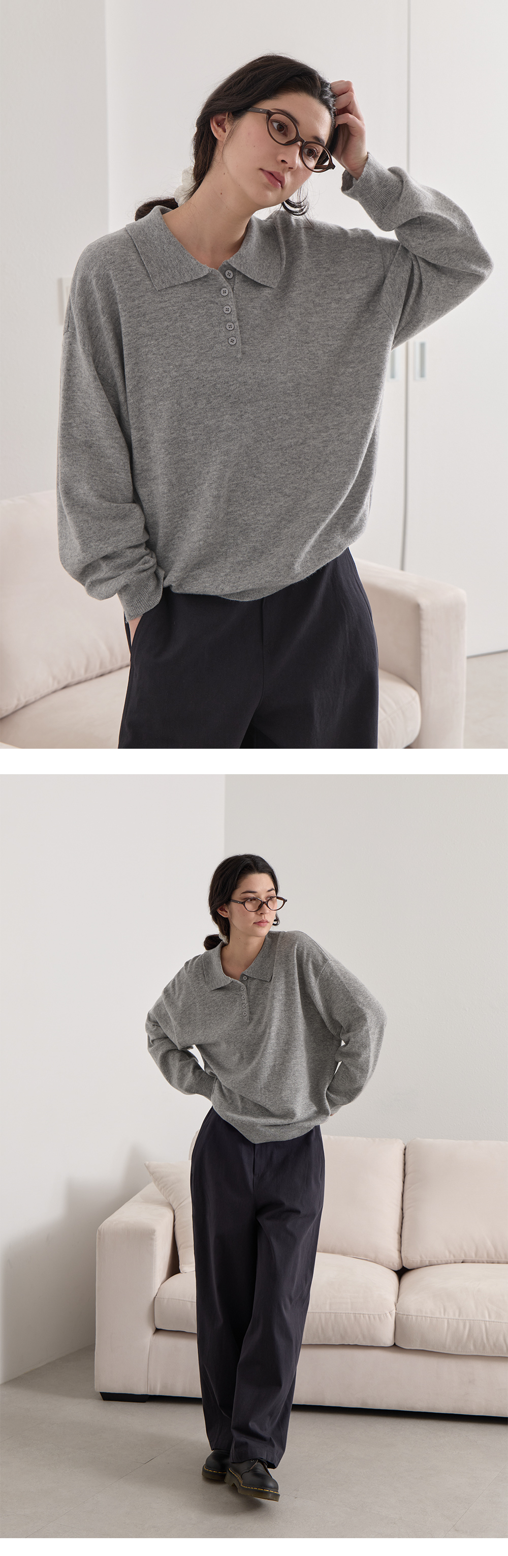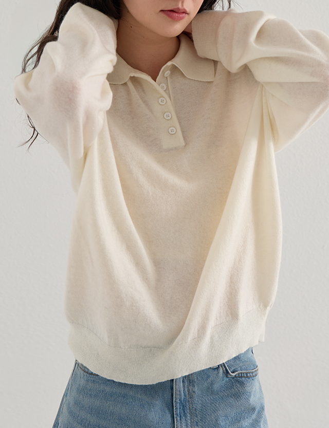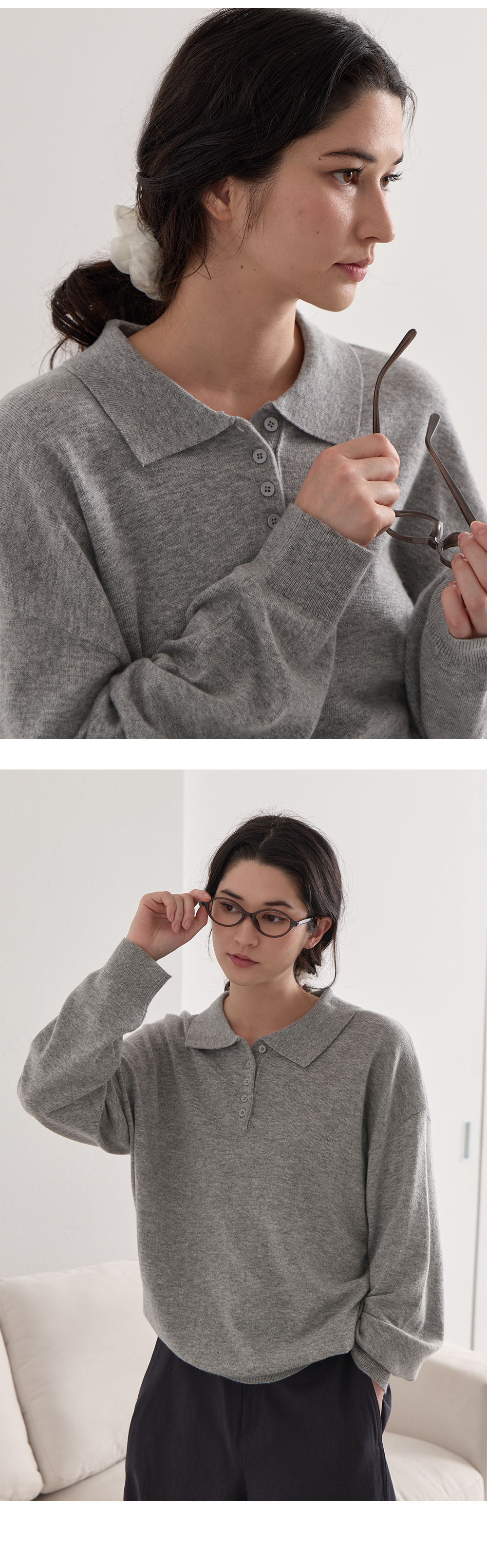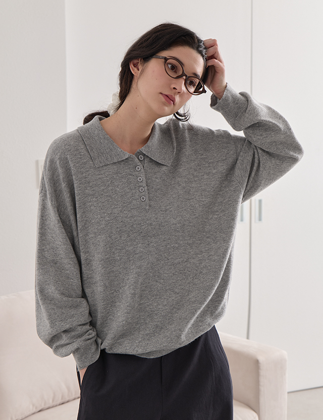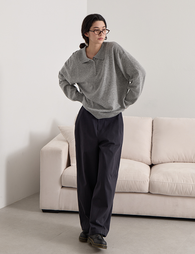 단정하면서 캐주얼한 무드를 연출하는 반오픈 카라 디테일