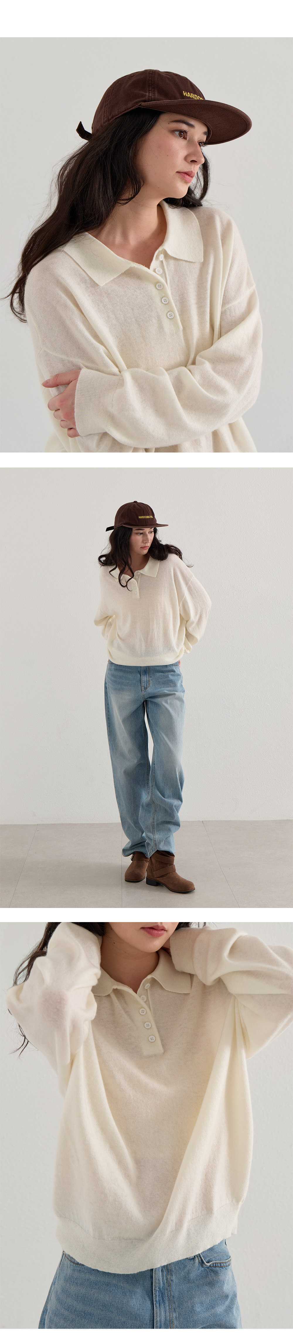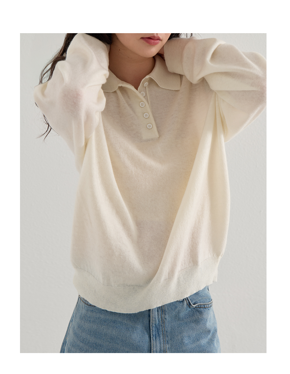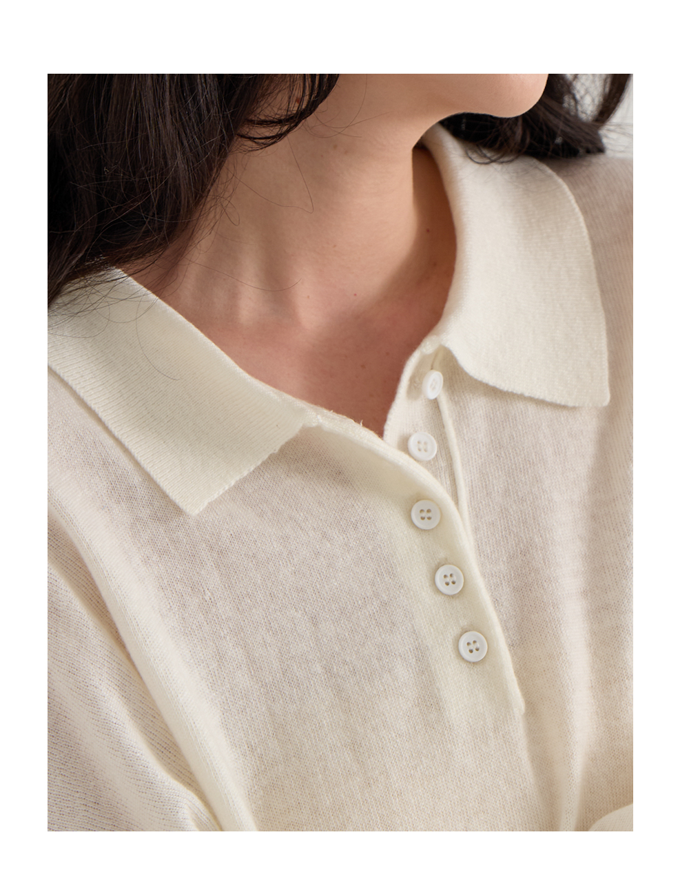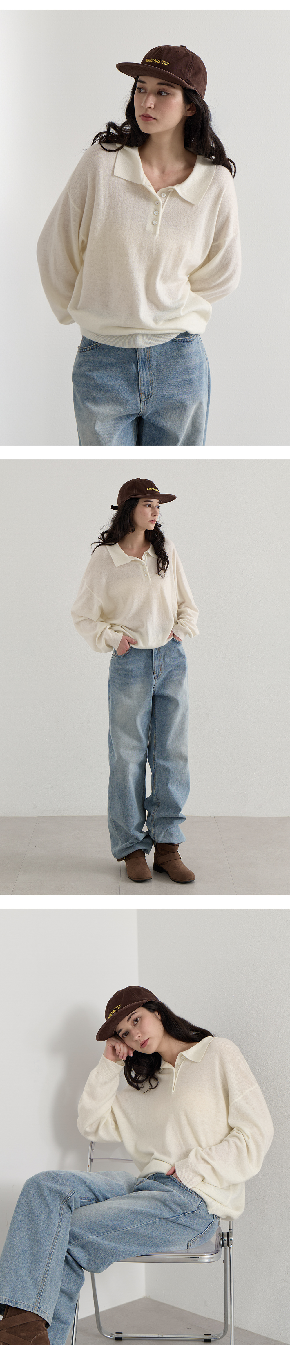단정하면서 캐주얼한 무드를 연출하는 반오픈 카라 디테일