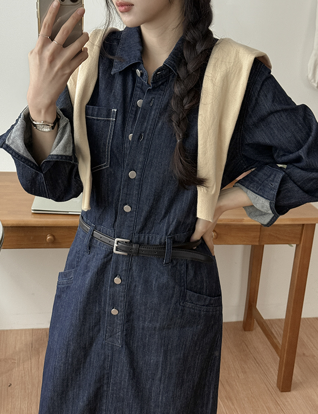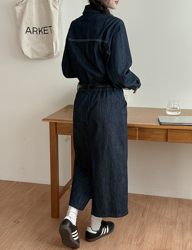 플라네 뒷밴딩 牛仔色 领 长款 连衣裙 86385