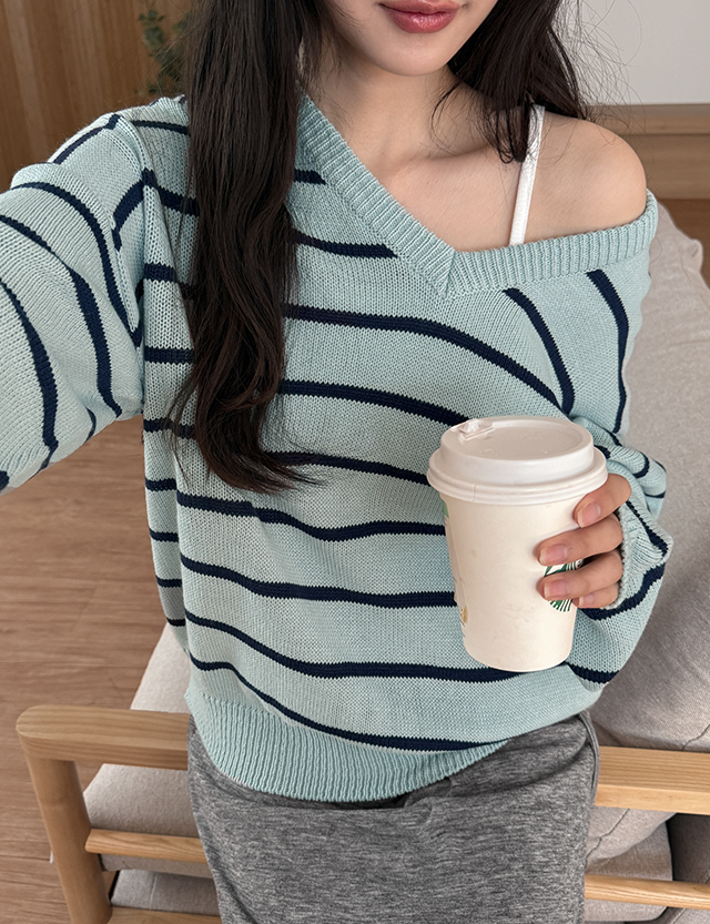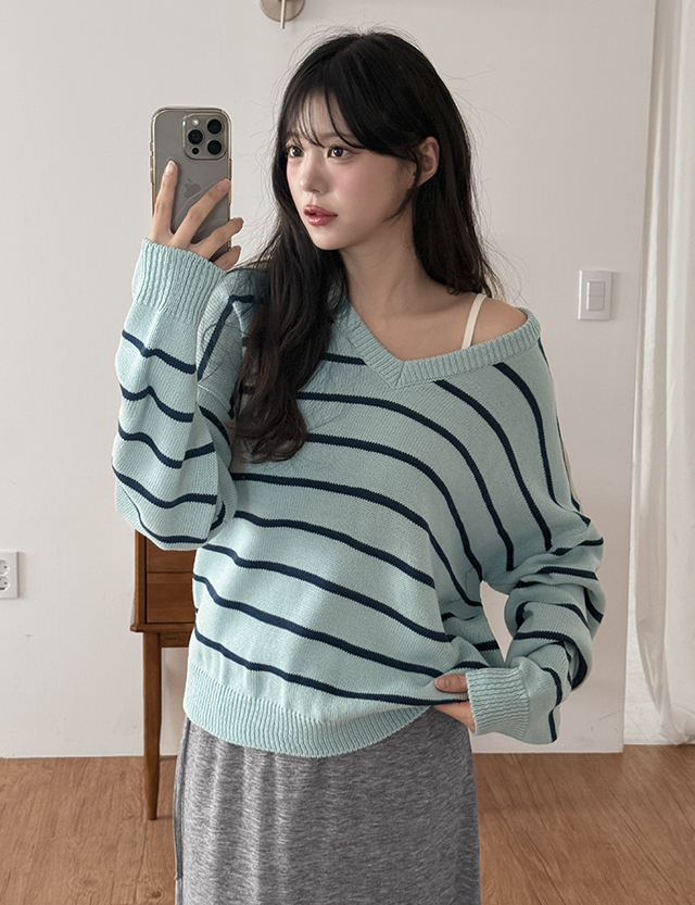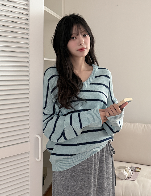 - 여리한 무드의 스트라이프 브이넥 루즈핏 니트