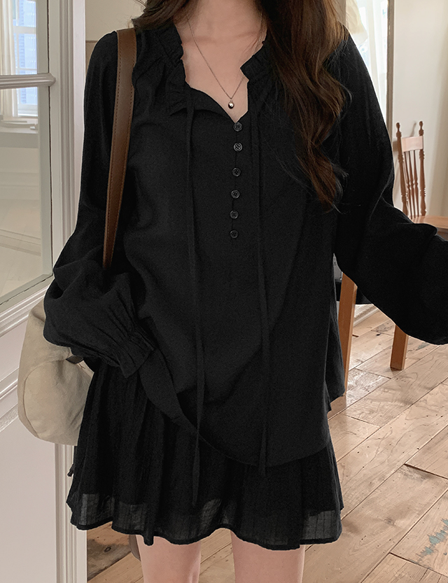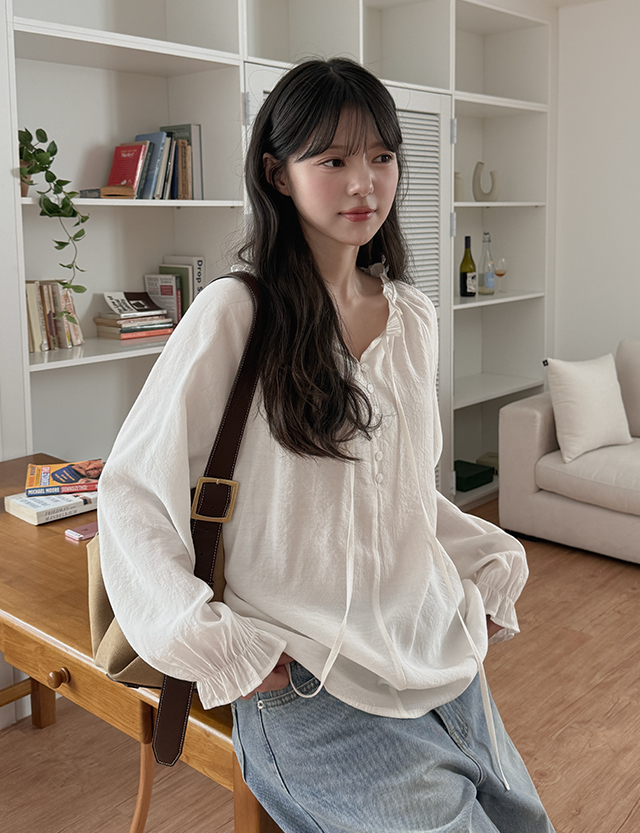 - 볼륨감있는 셔링 소매가 여성스러운 곡선 강조