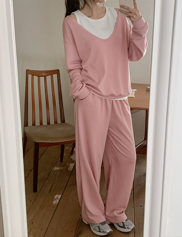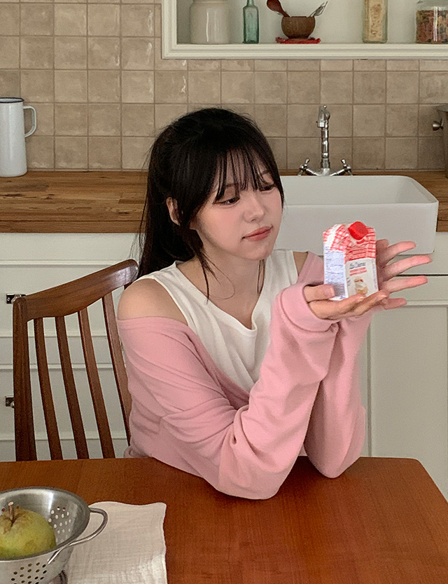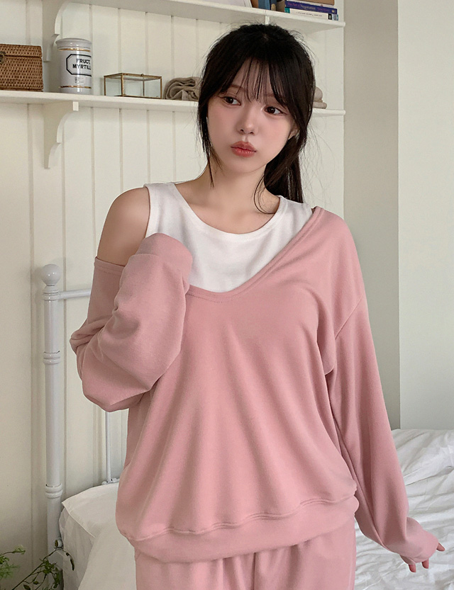 - 오프숄더 스타일의 브이넥 맨투맨으로