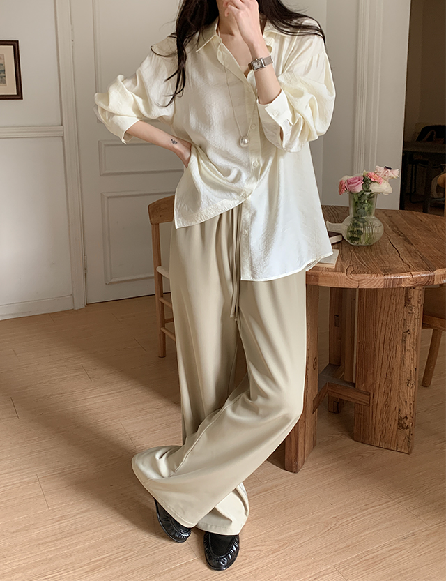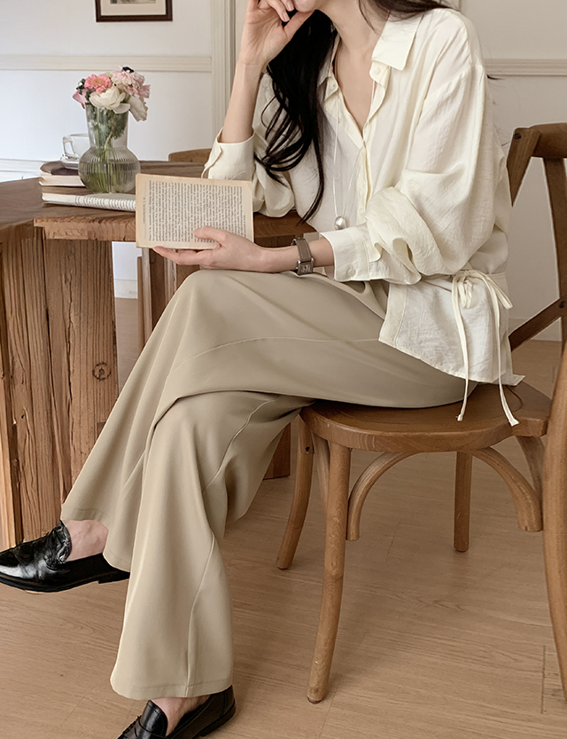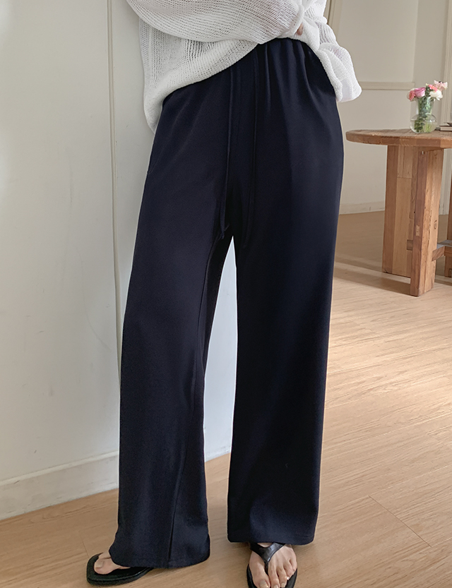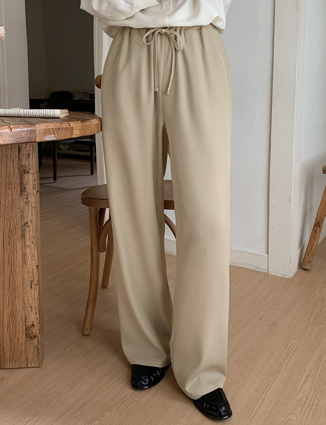 깔끔한 무드를 살린 전체 밴딩 와이드 슬랙스