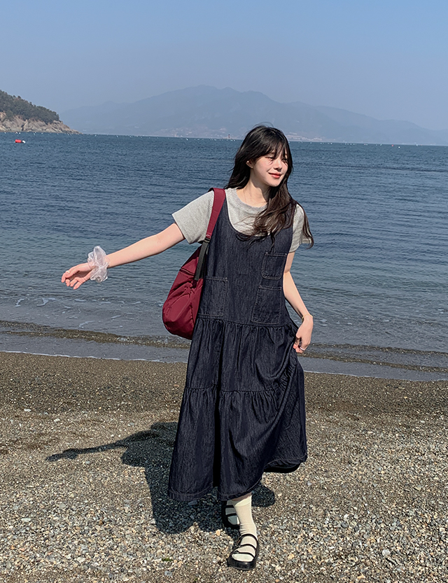 귀여운 캉캉 디자인을 더한 데님 원피스예요.