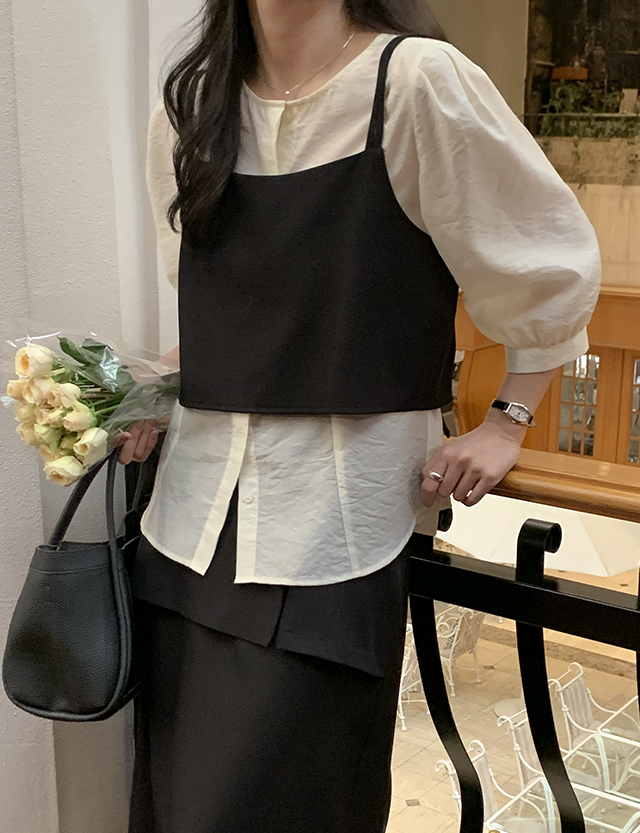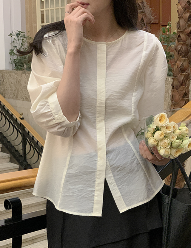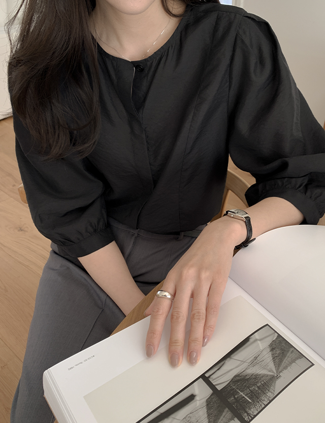 - 어깨 턱 디테일로 퍼프지는 7부 소매 라인 완성
