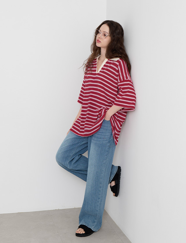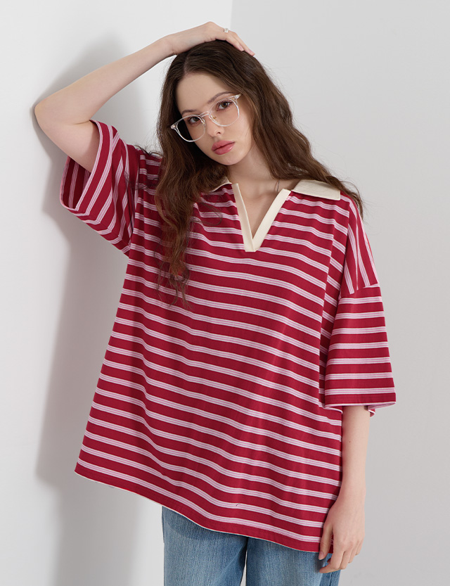 키루 条纹 领 宽松 T恤衫 87341