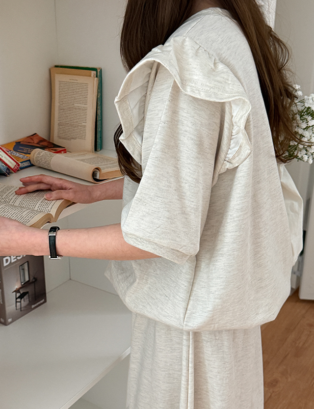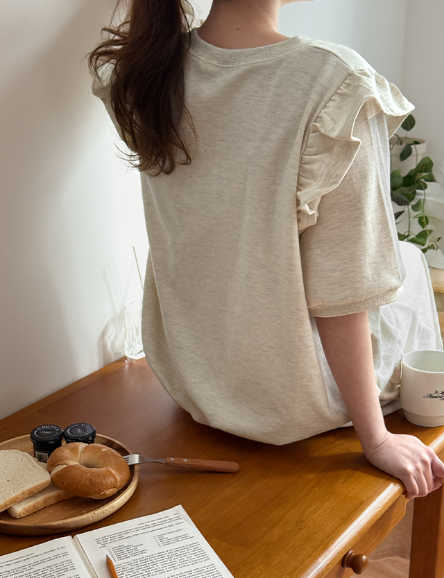 - 캐주얼하면서도 여성스러운 포인트가br> 더해진 어깨 프릴 디테일