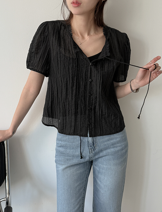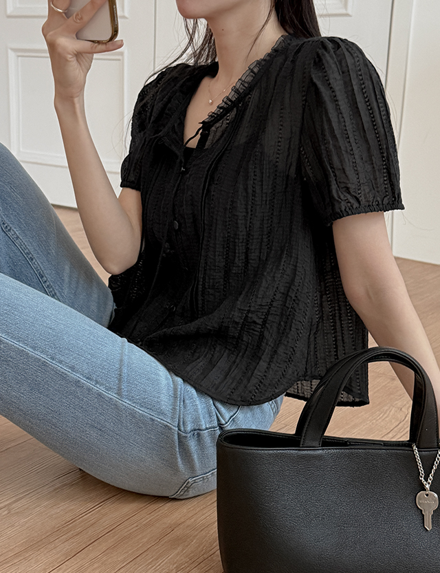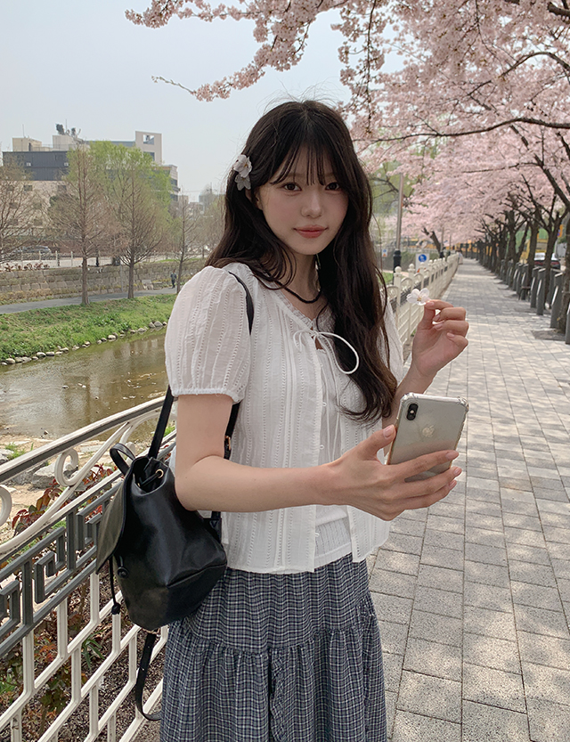 - 앞넥 끈 디테일로 가볍게 묶는 리본 연출