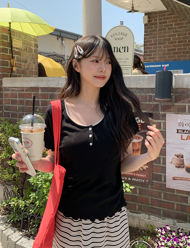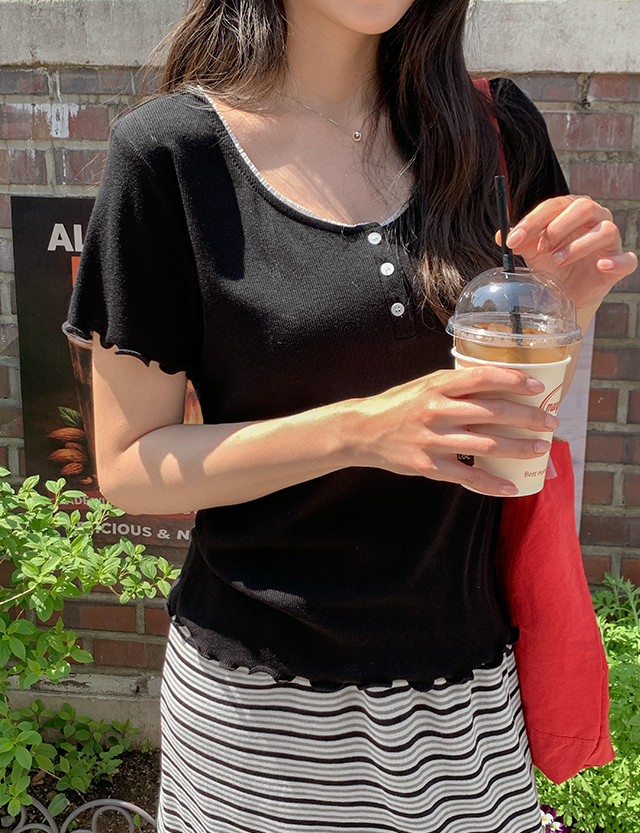 적당히 파인 라운드넥을 따라 얇은 레이스 장식을 덧대어