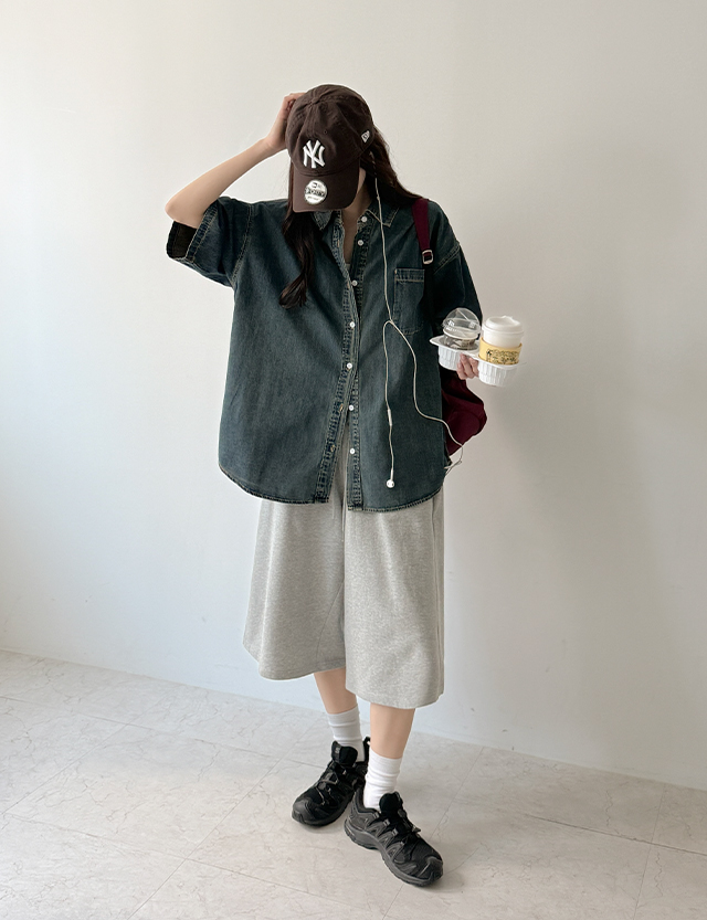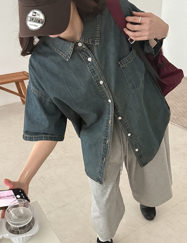 라페센 宽松 半袖 牛仔色 衬衫 87564