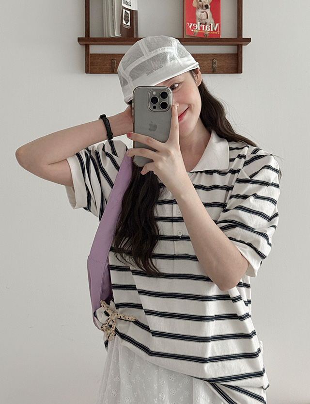 마쥬 条纹 泡泡袖 领 半袖 T恤衫 87710