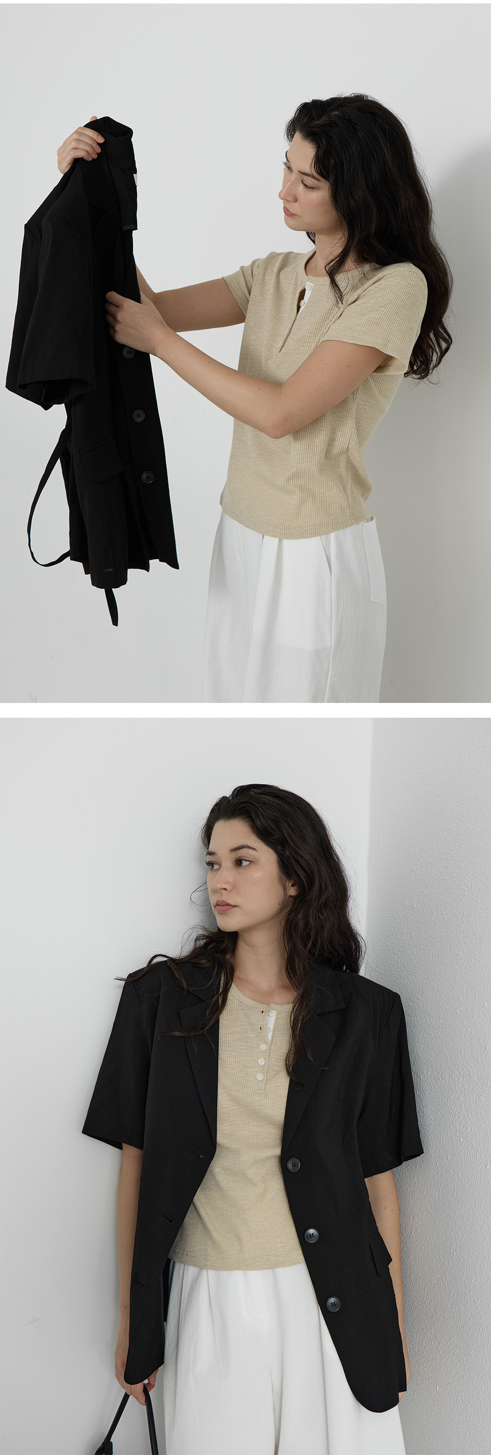 · 배색 톤의 프론트 버튼 디테일로 은은한 포인트