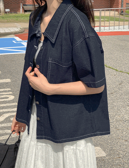 靛蓝色 宽松 半袖 牛仔色 衬衫 81631
