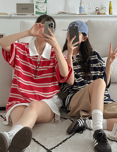 스카피 条纹 领 T恤衫 83162