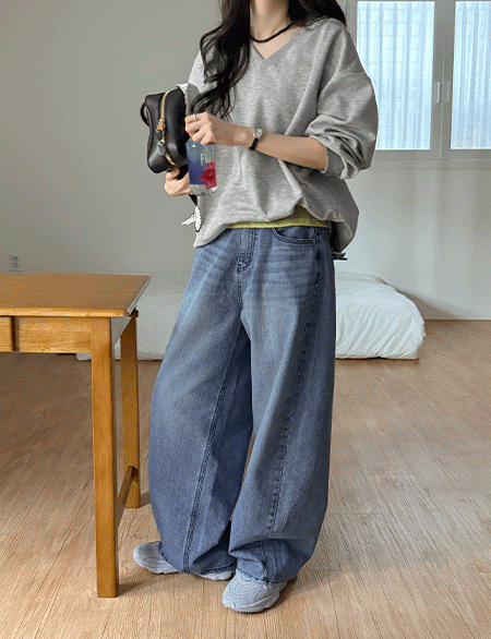 모아 포켓 缝线 커브 宽 牛仔裤子 86302