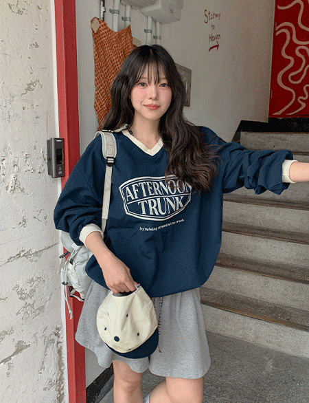 에어린 颜色 配色 나일론 V领 宽松 套头卫衣 87260