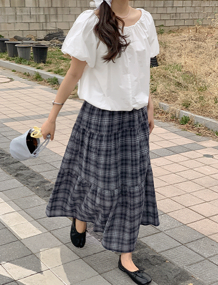 시원살랑 松紧带 格子 层褶裙 长款 裙子 87398