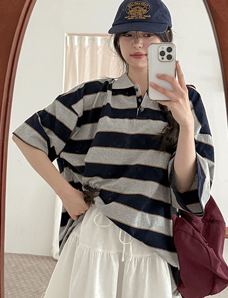 쿼칸 宽松 条纹 领 半袖 T恤衫 87509